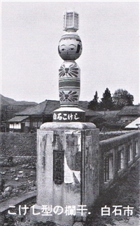 現在も4本の親柱の上にはそれぞれ「こけし」のモニュメントが置かれているが、写真で見る初期の塗装は本格的で、頭の上に照明があったとは驚きの構造だ。