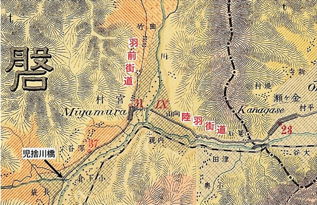 ただし、測量地点を示す丸印の位置はどんぴしゃりもあれば、はてな?と首をかしげたくなるところもある。前点「深谷」の丸印は本来なら児捨川橋の北詰にあるべきだが完全にズレている。高距数値の「37」は地理局の測量成果「37.6484m」と合致。本点「宮」の場合は丸印の位置も高距数値の「31」も地理局の測量成果に合致している。