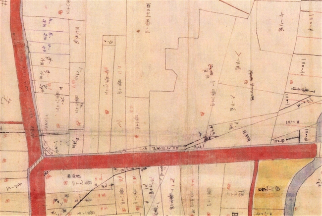 明治19年に作成された旧公図には隅切り部分が加筆されている。上の図面に戻って確認していただきたい(分岐点の丁字路東南角に描かれた黒い線)。