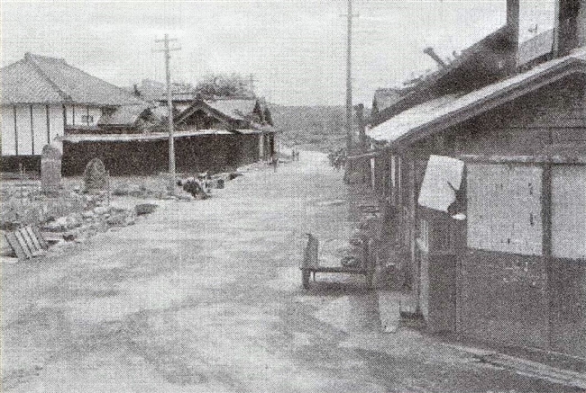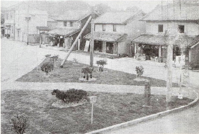 なお、緑地帯に黒っぽい角柱が建っているのが確認できる。これは現在、蓮蔵寺参道入口に建っている日露戦争に従軍した人たちが建立した道しるべと思われる。なお、道しるべの刻銘は「東 仙台方面至金ヶ瀬村」「南 福島方面至白石町」「北 遠刈田方面至各温泉」である。