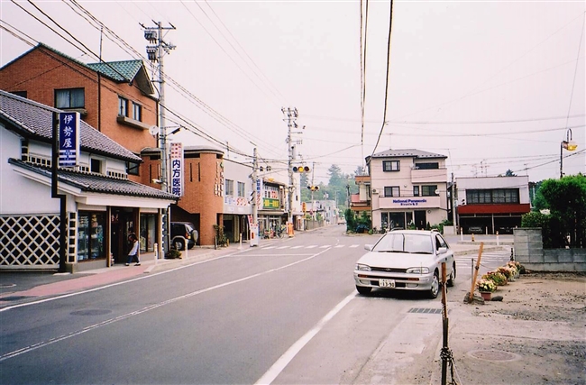 丁字路から東進する陸羽街道を見る。この奥は松川に架かる宮大橋である。右側の「松崎ストアー」という赤い看板が印象的だが、左側の歩行者信号の脇にも赤い看板がある。この建物の東隣りが蓮蔵寺の参道入口である。