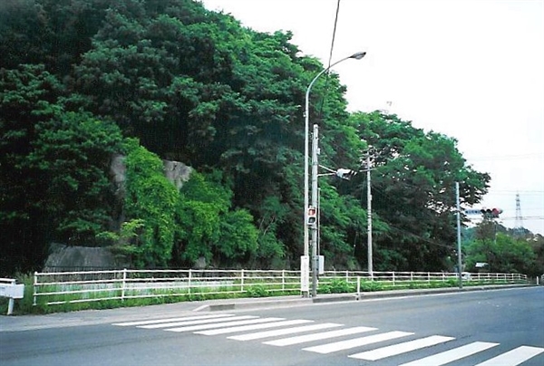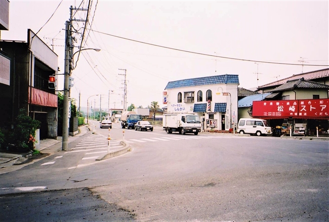撮影位置は昭和11年の国道改良で隅切りされた曲線が始まる場所で、道路敷は右へ弧を描く。