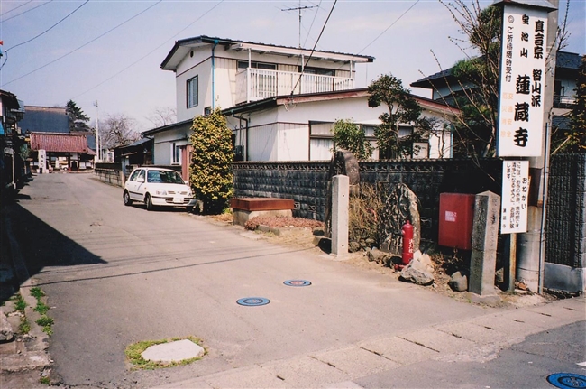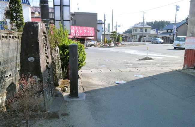 蓮蔵寺の参道内から陸羽街道の丁字路を望む。手前の石塔が蔵王塔。