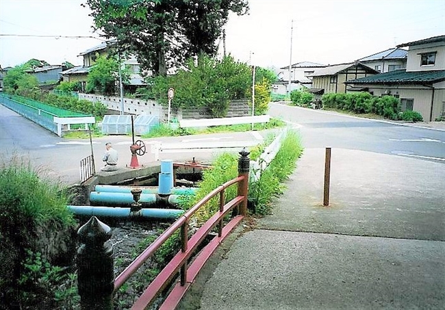 註)明治8年の『刈田郡深谷村絵図』で深谷字青木の場所を探せば、児捨川橋の北西に「第五十八番字青木囲」と見える。『写真帖』には橋の名前は記されていないが恐らく児捨川橋と思われる。また、川の流れを見ると橋の下流側から撮影したと判断できることから、画像は児捨川橋の南詰を写したものと推定している。(残念、反対側だ)