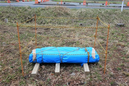 真相はブルーシートに包まれていて不明だが、長さや1本あたりの太さから推測して一里標である可能性が高いとみる。