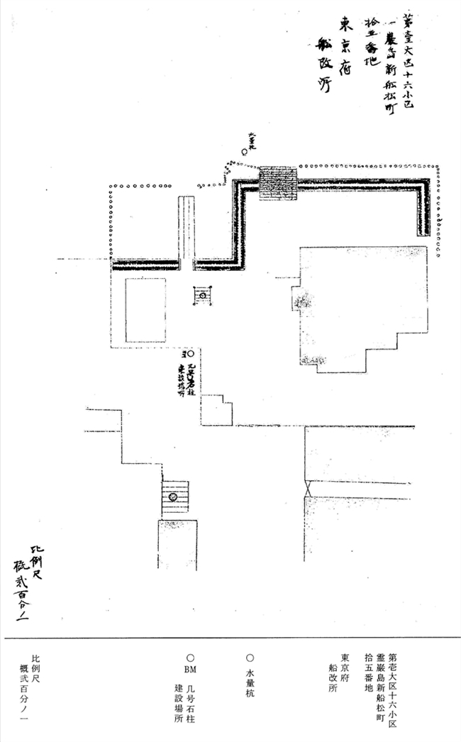 地蔵台石に几号を刻んで間もない時に常楽院が提出した書き出し。記事は附図に関連した部分のみを掲載した。注目は地蔵尊の項に「地理寮ヨリ台石ヘ印シ御彫附」と記されている点である。まさに台石に几号が刻まれていることを報告している。住職にとっては印象深い出来事だったのだろう。なお、附図における地蔵尊の場所は赤い線で囲んだ。これは地理局の『東京実測全図』に記された几号の位置とも合致している。