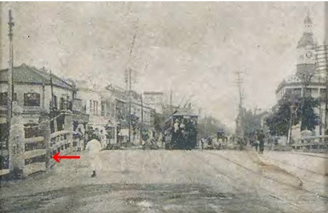 京橋の欄干が石造擬宝珠当時の古写真や絵葉書は数多く残されているが、几号を刻んだ石柱が写っているものは数が少ない。画質は悪いがその中の1点。(京橋繁盛記) 地理寮の図面に基づけば矢印の先に几号が刻まれていると思われる。