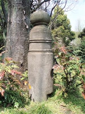 問題は日比谷公園にある明治の京橋欄干石柱である。ほぞ穴から見て親柱でないことは明白である。かつては「京橋」と刻まれた親柱とともに大正11年の架け替えの際に移設されたようだが、「京橋」銘の親柱は昭和9年に京橋へ戻り、この1本だけが日比谷公園に残されて今日に至っている。さてさて親柱でもない欄干柱を移設保存した理由とは何か? もしこの石柱に几号が刻まれているとしたら土の中となる。 |