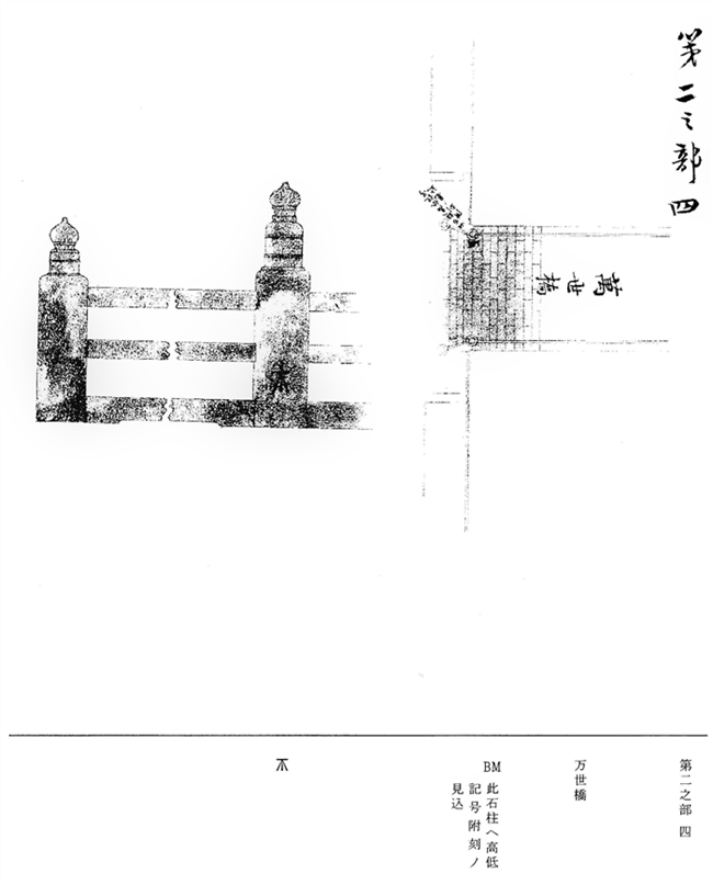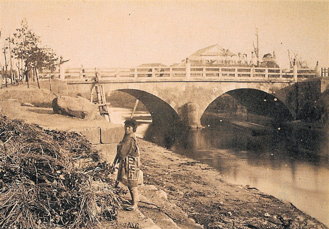 古写真。北詰の西側から見た万世橋。地理寮の図面に基づけば対岸の右から2本目の欄干石柱に几号を刻んだことになっている。
