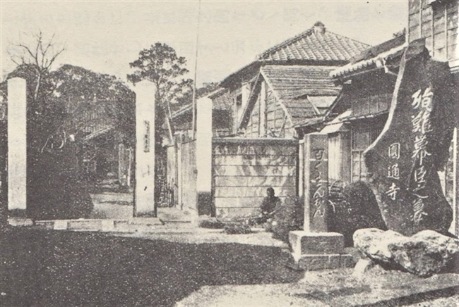 明治後期における円通寺の門前を写した画像。「殉難幕臣之墓」の碑と並んで「百くわんおん」碑が建つ。その台石に刻まれた几号も横棒がはっきり見て取れる。