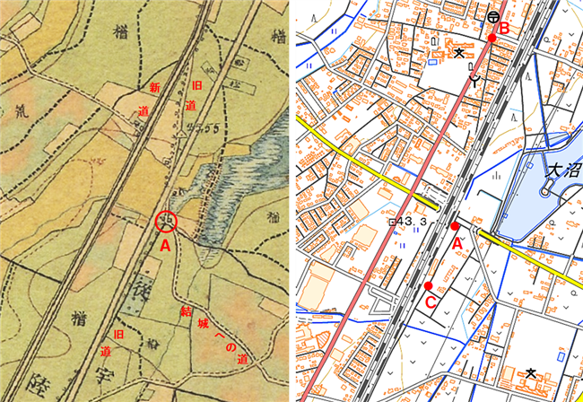 国立研究開発法人農業環境技術研究所が提供している歴史的農業環境閲覧システムの比較地図を利用し、明治の迅速測図(陸軍)と現在の地図(国土地理院)に加筆したものである。「石造幟椊」は陸羽街道に面したAの小円の範囲にあったと思われるが、現在は西に約270m移動してBの位置にある。