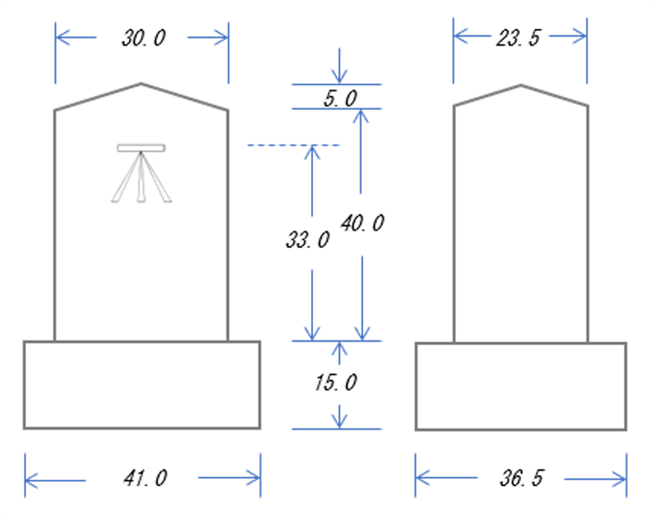 台石の一段目は高さ28.5cm。二段目は幅70.8p、高さ41.5p。几号の横棒は二段目底辺から20pの高さ。縦棒は右端から35.9p、左端から34.9pの位置にある。画像をよく見ると最下部にもう一段台石があるようだ。2度訪問したにもかかわらず確認を怠ってしまった。